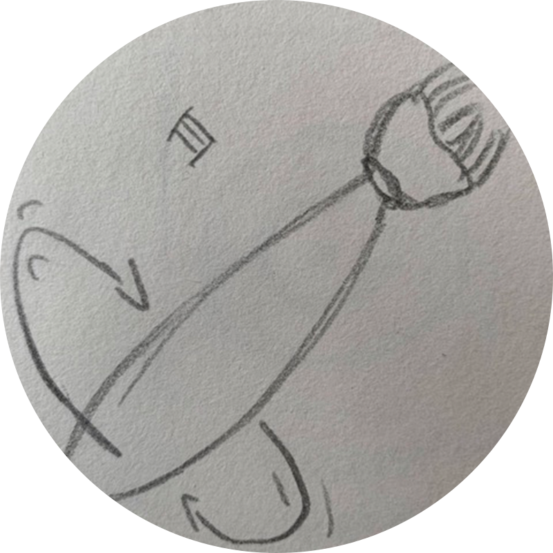 Tijdens de derde ronde heb ik gebruikgemaakt van de creatieve techniek “Superheld”. Weer koos ik de fictieve superheld Macgyver als inspiratiebron, met zijn eigenschappen als vindingrijkheid, wetenschappelijk denken, praktische oplossingen, innovativiteit, het gebruik van gewone spullen en intelligentie. Hoe zou hij deze casus aanpakken en hoe kan ik zijn eigenschappen toepassen op het bedenken van een een nieuwe manier van tandenpoetsen? De volgende schetsen zijn naar aanleiding hieruit ontstaan.